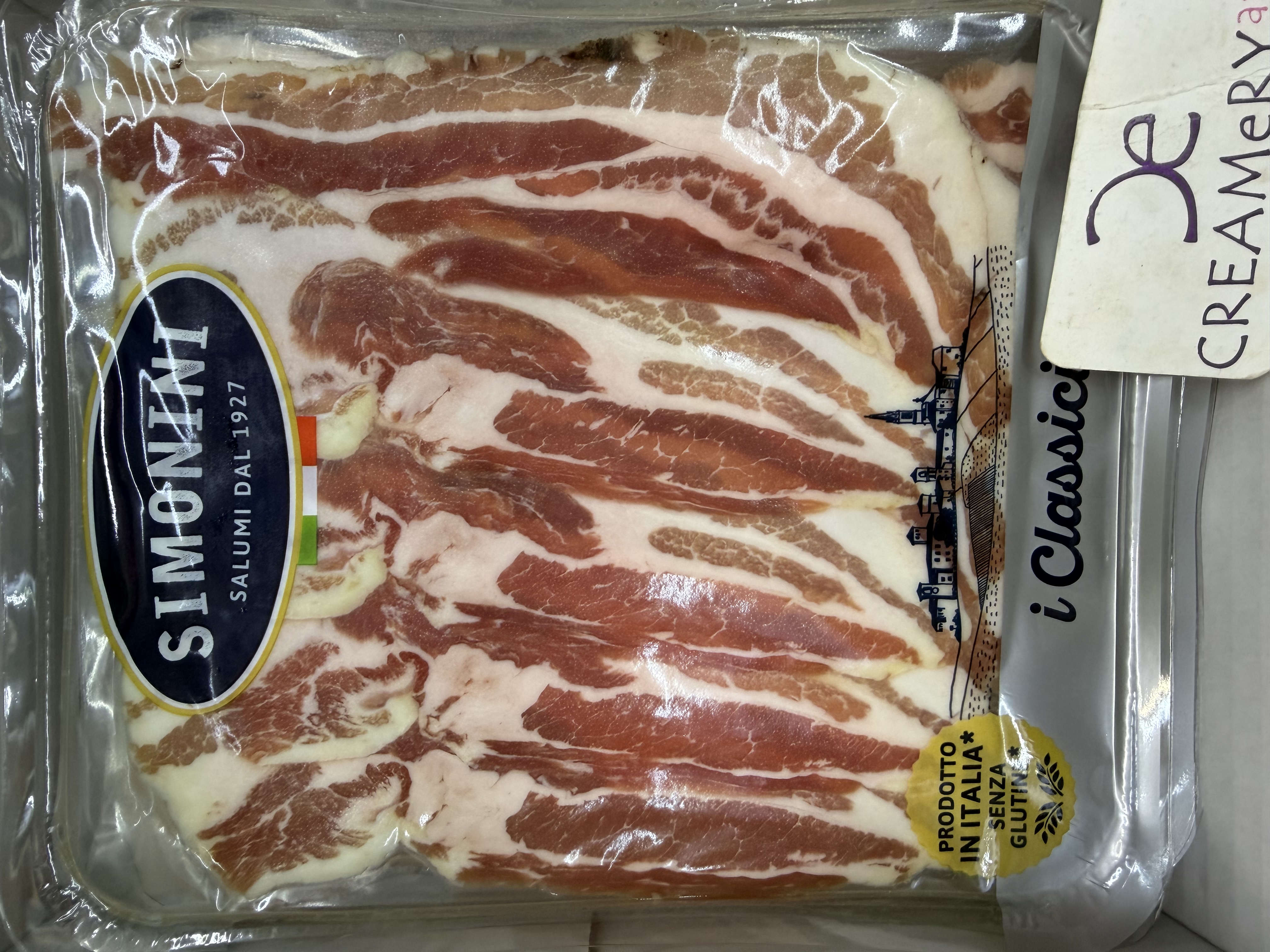 意大利切片煙腩(不含防腐劑!)Italian SIMONINI Sliced Pancetta 100g $38/pack Pancetta是一種醃製的豬腩肉。 意大利人將豬的腩肉以不同做法,會包括天然海盬,豆蔻、胡椒、茴香、辣椒和大蒜等材料醃製和風乾三個月,跟我們平日吃的 Bacon 煙肉有點不同,另外意大利人最喜歡肥肉較多的煙腩肉,更加美味😋 適用於Carbonara意粉,混入Pizza餡料,配肉丸,煎香做前菜或配合其他蔬菜都係很美味。 保存方式:冷藏於0-4℃