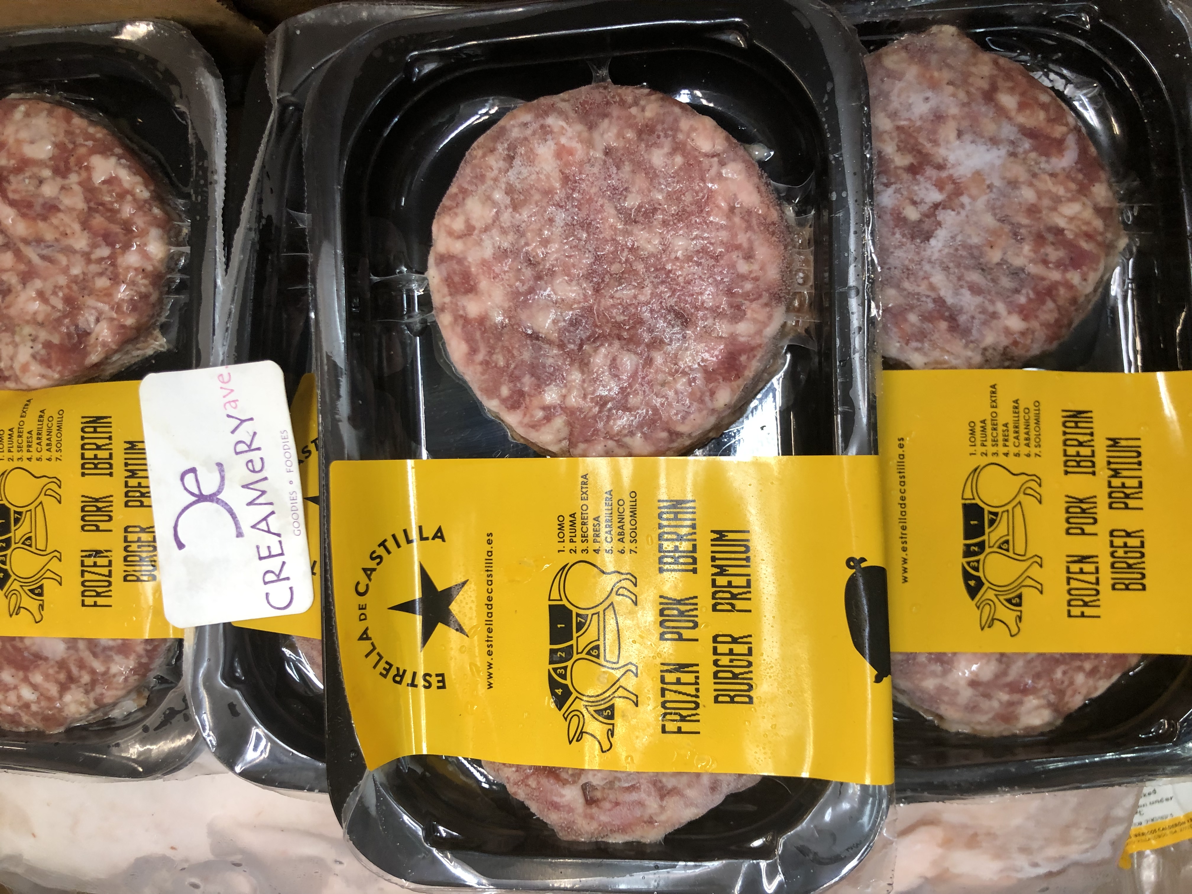 西班牙黑毛豬漢堡(也稱為伊比利亞黑毛豬漢堡)是以放養的西班牙黑毛豬製成的漢堡肉排。 這種豬肉因飼養時食用橡果、香草等天然食物,肉質細膩、風味獨特,帶有橡果香氣,並富含不飽和脂肪,口感鮮嫩。 建議煮法:大火煎香兩面,冚蓋細火焗12分鐘。 保存方法:-18 ℃冷藏